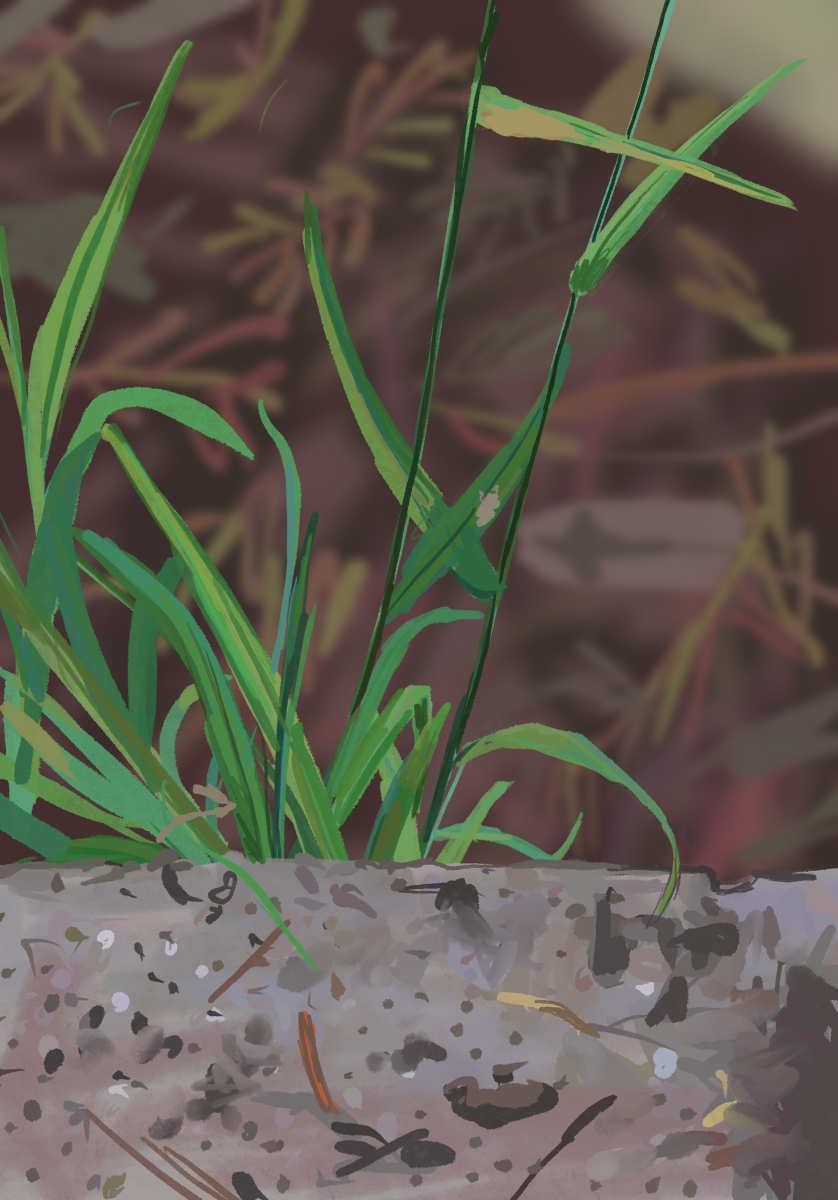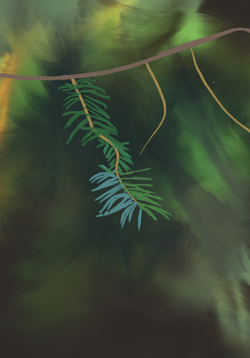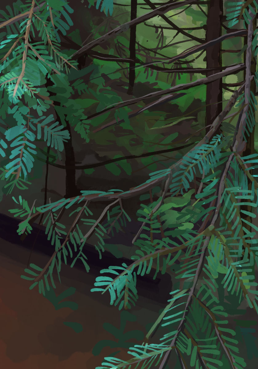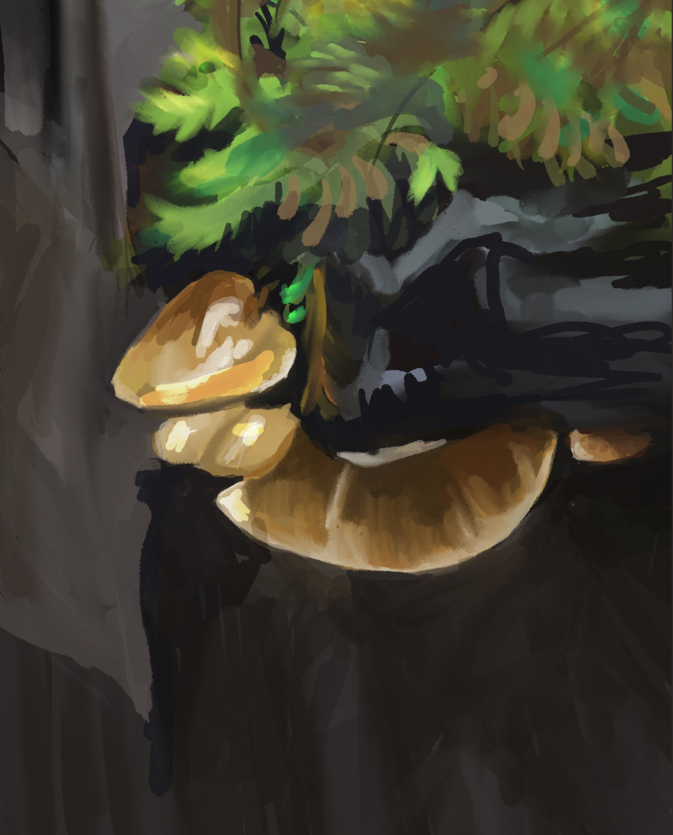 Shade is the rule while direct sunlight is the exception. There are very warm reds and brilliant yellows contrasting with rich blue shadows, with everything being filtered through green. I have tried to pursue the hypnotic quality of this place in my paintings. It really has a feeling of eternal twilight to it. At the same time, I am pushing myself to explore a higher level of fidelity regarding the abundant natural textures in the forest like bark, lichen, and leaves. I also want to explore how to convey the large scale of the trees in such small paintings.